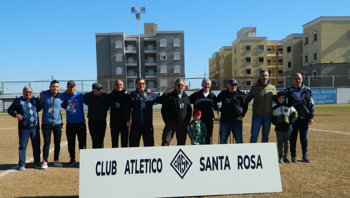 El Club Atlético Santa Rosa está cumpliendo cien años de existencia en este 2023. El homenaje se llevó a cabo en ese marco y se hizo minutos antes del partido que el local animó con Unión de Miguel Riglos, por lo cual el público presente pudo disfrutar del acto y agradecer a quienes les hicieron gritar goles en épocas anteriores.