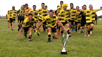 La fiesta fue completa para el Canario. Porque hace dos semanas, en ese mismo estadio, logró el ascenso a la Primera "A" y ayer, tras una serie muy disputada, coronó el año levantando la copa de campeón ante el gran marco de público que se hizo presente en el estadio "Héctor Sánchez".