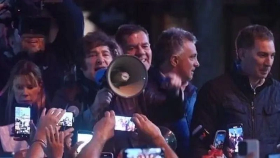 Ya en la caja de la camioneta, Milei tomó un megáfono y comenzó con su discurso. "Vengo a pedirles el apoyo para mis candidatos. Con Diego Santilli, con Karen Reichardt", expresó el Presidente, y continuó: "Les pido que no aflojen, estamos a mitad de camino".