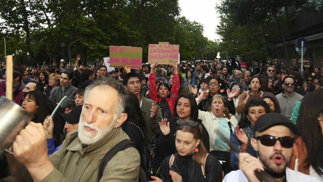 Un grupo de manifestantes se congregó ayer en los alrededores del céntrico teatro Roxi de Mar del Plata, a donde acudió el presidente Javier Milei para ver la obra "Fátima 100%", de su pareja Fátima Flórez, para protestar contra el DNU y la "ley ómnibus" que buscan generar fuertes reformas al Estado.