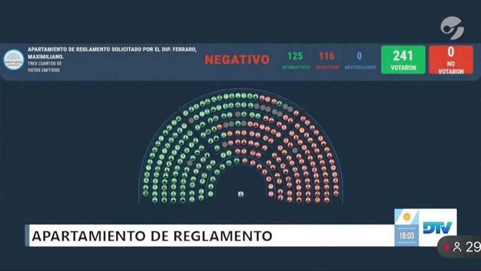 La votación arrojó 125 votos positivos y 116 negativos, pero como los expedientes no tenían dictamen se hubiera requerido una mayoría agravada de las tres cuartas partes de los diputados presentes, constató la Agencia Noticias Argentinas.