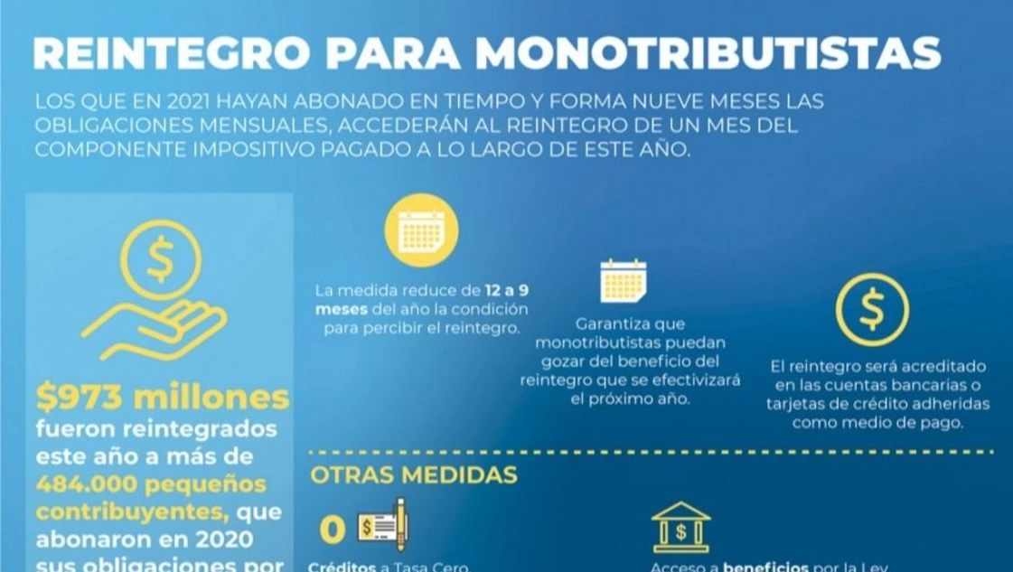 Los monotributistas que durante 2021 hayan abonado en tiempo y forma nueve meses las obligaciones mensuales, accederán al reintegro de un mes del componente impositivo pagado a lo largo de este año.