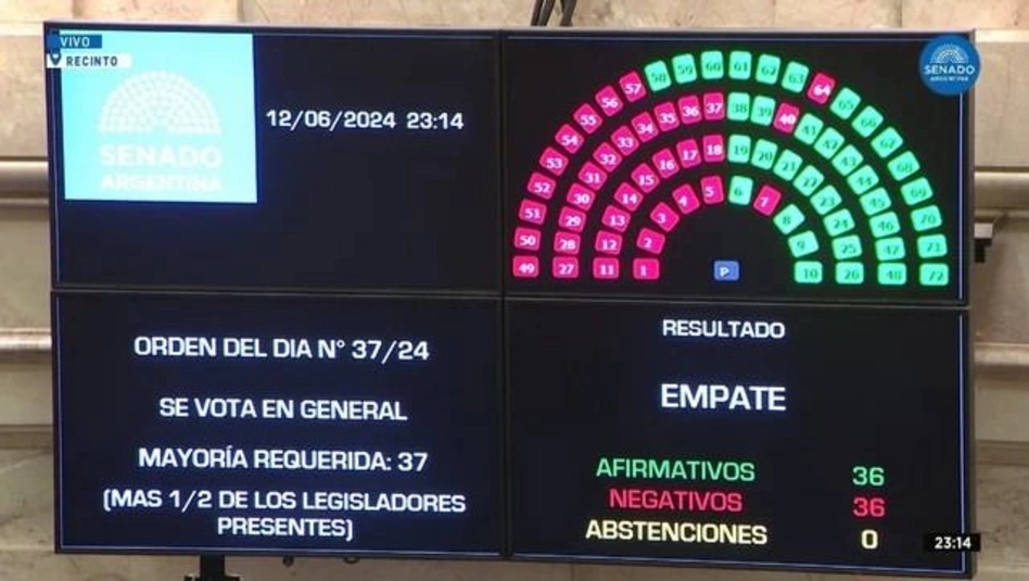 El Senado aprobó esta noche la Ley de Bases, en medio de un clima de tensión dentro y fuera del recinto. Tal como se esperaba, hubo paridad de votos: 36 a favor y 36 en contra. La vicepresidenta y titular de la Cámara alta, Victoria Villarruel, desempató en favor del Gobierno.
