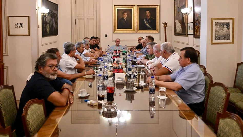El encuentro tuvo lugar en la sede de UPCN, donde el jefe de los estatales, Andrés Rodríguez, hacía de anfitrión. Convocaron los triunviros Jorge Sola, Cristian Jerónimo y Octavio Arguello.