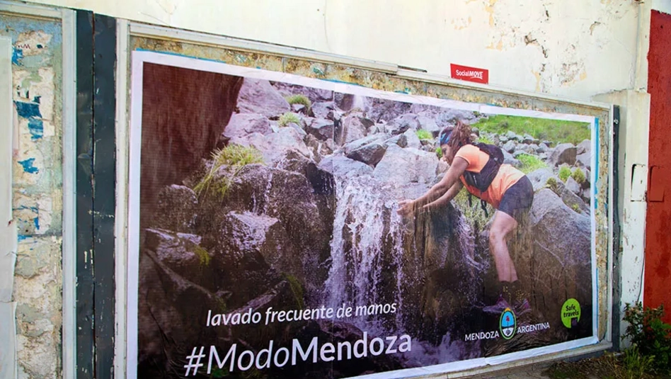 En la gigantografía se puede observar a una mujer con sus manos dentro del agua de una cascada, apoyada sobre las piedras de una montaña. Esa fotografía está acompañada con la leyenda «lavado frecuente de manos» y el hashtag #ModoMendoza, que tiene a sus costados el logo de la marca provincial.