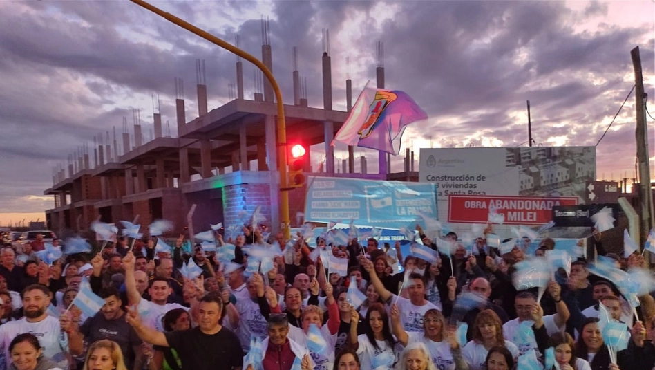 En la esquina de Gaich y Toscano Sur se realizó un reclamo en defensa de la obra pública, en frente a la construcción abandonada del Procrear (foto). También hubo concentraciones frente al Centro Cultural Medasur en defensa de la educación pública, la diversidad cultural y los pueblos originarios; en el Hospital René Favaloro en defensa de la salud pública, de las y los jubilados y las personas con discapacidad; ; y en la plaza del barrio Villa Elvina, en la esquina de Güemes y Pichincha, se hizo una intervención alrededor del mapa de La Pampa emplazado allí con la consigna “Defendemos La Pampa”.