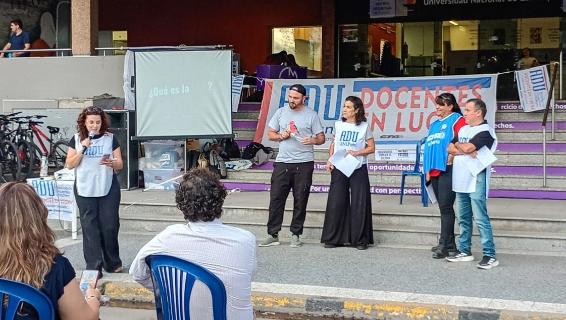 Durante la misma intervinieron Mariana Cornejo (ADU La Pampa-FCH), Gustavo Silvestre (ADU La Pampa-FCH - SIPREN), Pablo Prato (ADU La Pampa-FCEyN) y Roxana Rechimont (ATE La Pampa – CTA A).