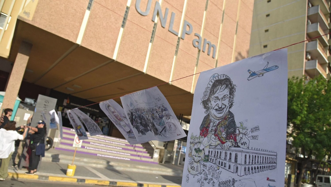 Los dibujos fueron exhibidos hoy por la tarde en la concentración de docentes y nodocentes frente a la Universidad Nacional de La Pampa.