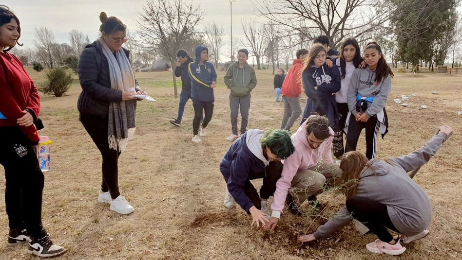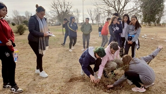 (Eduardo Castex) - Trabajadores municipales y alumnos del colegio Manuel Belgrano ayer plantaron especies de caldén, piquillín, azar de monte, molle, algarrobo, chañar y retama amarilla para crear un "parque de flora autóctona" en el predio del Parque de la Prehistoria de Eduardo Castex.