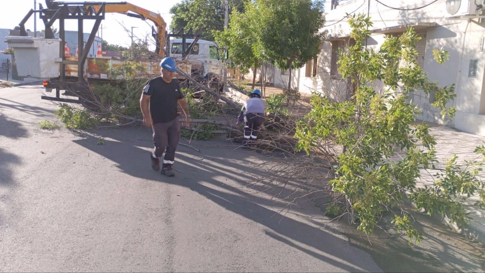 En Toay, sobre calle Sarmiento, entre España e Italia, personal de la CPE, Defensa Civil y de la misma municipalidad, estuvieron trabajando juntos para quitar un árbol caído sobre el tendido eléctrico.