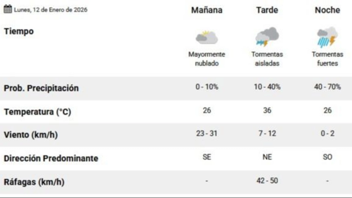 Para el martes 13 de enero, tormentas aisladas y chaparrones tanto para las horas de madrugada como para la mañana. El resto del día se mantendrá mayormente nublado. El agua va a traer un poco de alivio al calor extremo de estos días, la mínima se va a ubicar en 20ºC, en tanto que la máxima llegaría a los 30 grados.