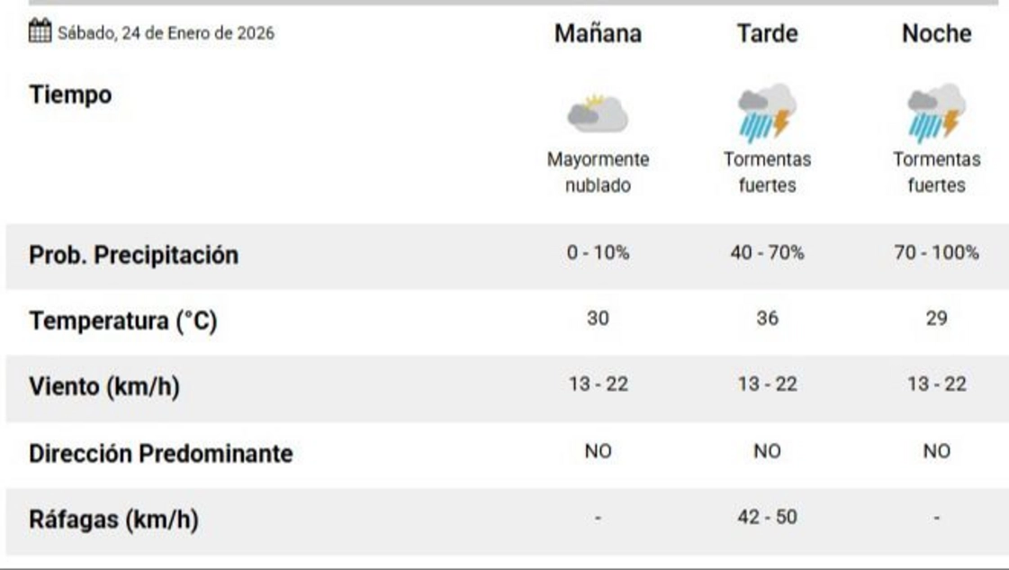 En cuanto al domingo 25, la mínima será de 23ºC y la máxima se va a ubicar en los 35 grados. La mañana arrancará con tormentas aisladas y se irán convirtiendo en tormentas intensas, fuertes, que cubren todo de gris y de lluvia y de más tormentas (40-70% de probabilidades). Las ráfagas de viento podrían ser intensas, de 42-50 km/h.