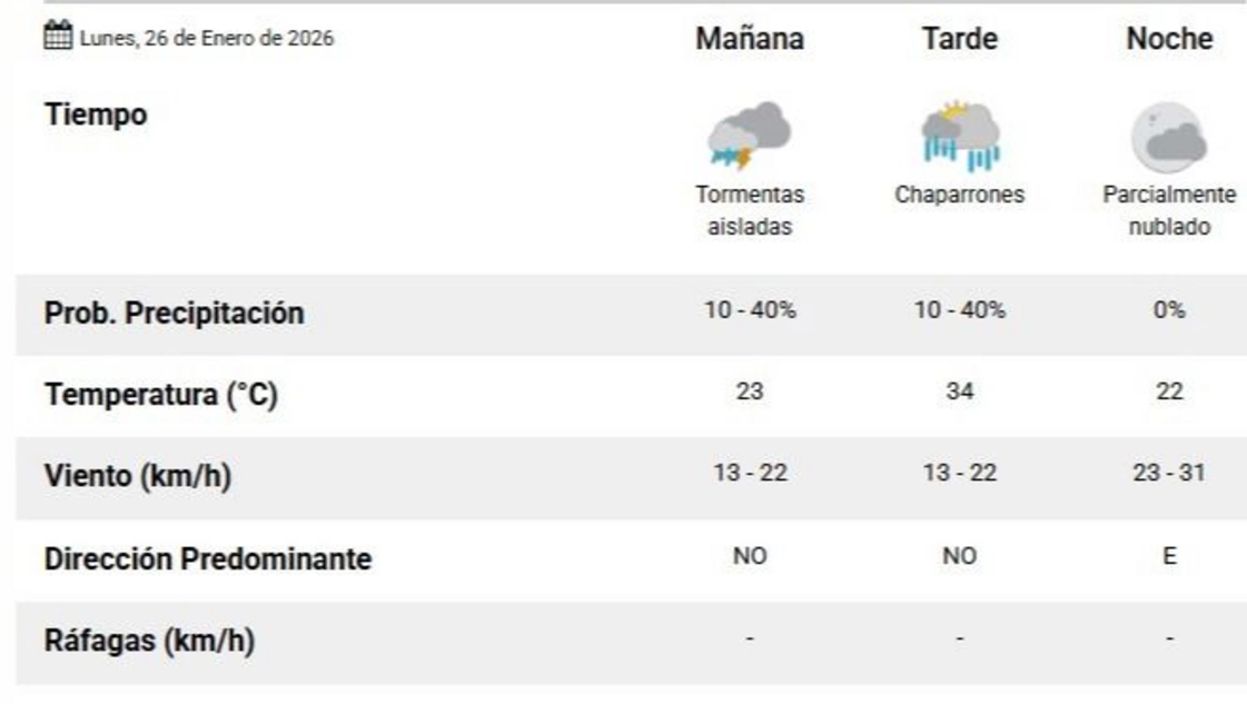 Según el Servicio Meteorológico Nacional (SMN) (en el pronóstico actualizado a las 6.12 horas), para este lunes 26 de enero en Santa Rosa la la temperatura mínima es de 18ºC, mientras que la máxima se ubicará en los 34 grados. De cualquier manera, el calor se va a hacer sentir. Durante la mañana del día de hoy continúan las tormentas, pero ya de manera aislada con un 10-40% de probabilidades, en cuanto a la tarde, podrían desarrollarse chaparrones dispersos (10-40%) y por la noche el cielo estará cubierto. La dirección predominante del viento será noroeste y este, por la noche. La humedad para la jornada del día de hoy es del 99%.