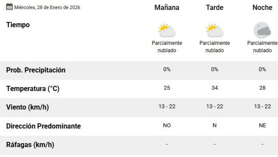 Según el SMN (en el pronóstico actualizado a las 6.02 horas), para este miércoles 28 de enero en Santa Rosa la la temperatura mínima es de 20ºC, mientras que la máxima se ubicará en los 34 grados. El calor se hace sentir. Crece como la hiedra. Silencioso. Trepa. El cielo estará parcialmente cubierto durante toda la jornada. No se sentirá el viento. Ni una gota. Ni una brisa. Nada. Solo calor. La humedad para la jornada del día de hoy es del 95%.