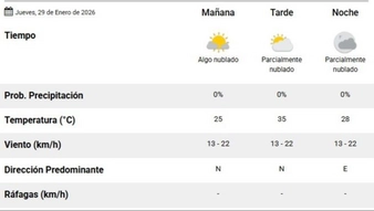En cuanto al viernes 30, para el inicio del fin de semana la mínima será de 20ºC y la máxima se va a ubicar en los 36 grados y la sensación térmica podría sentirse todavía más. Último día de calor extremo. Intenso. Que agobia. Para toda la jornada el cielo estará cubierta, de a momentos algo nublado, en otros momentos, parcialmente cubierto. Recién por la noche se podría llegar a sentir algo de alivio con tormentas aisladas (10-40% probabilidades).