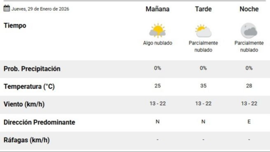 Según el SMN (en el pronóstico actualizado a las 6.13 horas), para este jueves 29 de enero en Santa Rosa la la temperatura mínima es de 22ºC, mientras que la máxima se ubicará en los 35 grados. El calor brota por todos lados. Silencioso. En el aire, en la tierra, en las paredes, en el agua de la canilla, todo es calor. El cielo estará parcialmente cubierto durante toda la jornada. No se sentirá el viento. Ni una gota. Ni una brisa. Nada. Solo calor. La humedad para la jornada del día de hoy es del 91%.