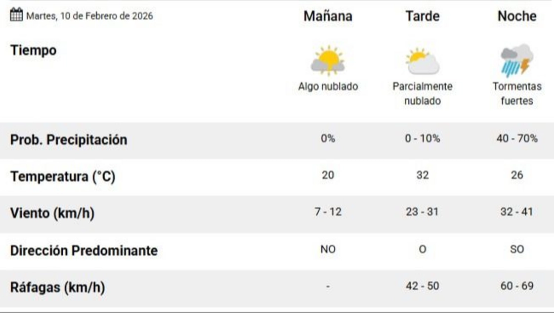 Según el Servicio Meteorológico Nacional (SMN) (en el pronóstico actualizado a las 6.03 horas), para este martes 10 de febrero en Santa Rosa la la temperatura mínima es de 15ºC y la máxima se va a ubicar en los 32 grados. Durante la mañana va a estar algo nublado, durante la tarde el cielo va a estar parcialmente nublado. Las nubes van a ir cubriendo todo, de a poco, y a la noche llegan las tormentas fuertes. Además, por la tarde y por la noche, se esperan ráfagas de viento que entre 40 y 70 km/h. Habrá viento del oeste y, después, del suroeste. La humedad para la jornada del día de hoy es del 84%.