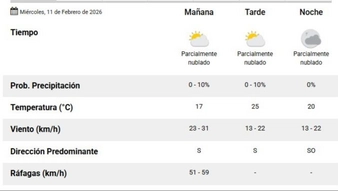 Según el Servicio Meteorológico Nacional (SMN) (en el pronóstico actualizado a las 6.19 horas), para este miércoles 11 de febrero en Santa Rosa la la temperatura mínima es de 14ºC y la máxima se va a ubicar en los 25 grados. Hay un descenso muy marcado de la temperatura. Para toda la jornada del día de hoy está pronosticado un cielo parcialmente cubierto. Va a oscilar entre un cielo celeste y abierto con nubes blancas que avanzan a la par del viento. Además, por la mañana se van a mantener esos vientos fuertes, con ráfagas de hasta 60 km/h. Habrá viento sur y suroeste. La humedad para la jornada del día de hoy es del 56%.