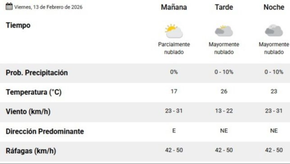 Según el Servicio Meteorológico Nacional (SMN) (en el pronóstico actualizado a las 6.03 horas), para este viernes 13 de febrero en Santa Rosa la la temperatura mínima es de 12ºC y la máxima se va a ubicar en los 26 grados. El frío durante la mañana se sintió. No va a faltar algún resfriado o con molestias en la garganta. De cualquier manera, no deja de ser un alivio a las olas de calor que hubo en enero. Y va a volver. Se espera otra ola intensa a partir del lunes. Mientras tanto, para el día de hoy va a estar fresco y mayormente nublado. Además, toda la jornada se van a mantener los vientos fuertes, con ráfagas de hasta 50 km/h. Habrá viento este y noreste. La humedad para la jornada del día de hoy es del 78%.