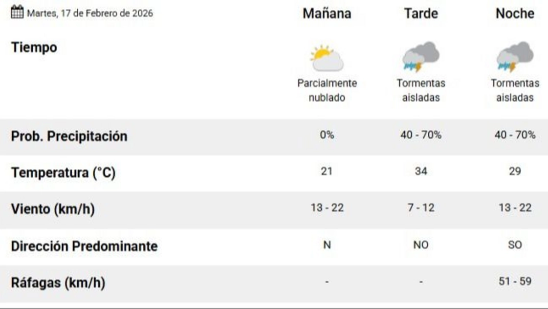 Según el Servicio Meteorológico Nacional (SMN) (en el pronóstico actualizado a las 6.02 horas), para este martes 17 de febrero en Santa Rosa la la temperatura mínima es de 19ºC y la máxima se va a ubicar en los 34 grados. La temperatura vuelva a subir, hoy va a hacer calor y también vuelven las lluvias. Durante la mañana el cielo va a estar parcialmente cubierto, pero por la tarde y la noche llegarían las tormentas aisladas con un 40-70% de probabilidades. Durante la noche el viento va a soplar fuerte, viento del suroeste con ráfagas que podrían alcanzar los 60 km/h. La humedad para la jornada del día de hoy es del 94%.
