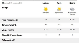 Según el Servicio Meteorológico Nacional (SMN) (en el pronóstico actualizado a las 6.13 horas), para este viernes 20 de febrero en Santa Rosa el cielo va a estar despejado y de a poco, durante el día, se va a ir nublando. Amaneció frío, con una mínima de 13ºC, pero el calor va a ir en aumento y la máxima va a llegar a los 32 grados. La dirección predominante del viento será este y norte. La humedad para la jornada del día de hoy es de 84%. El sol se pondrá cerca de las 20.10 horas.