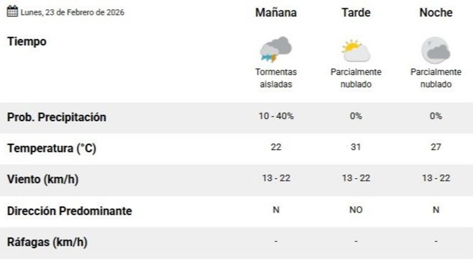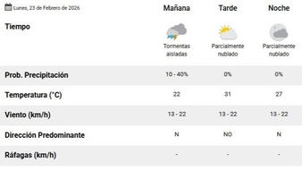 Para el martes 24, el cielo oscilará entre parcial y mayormente cubierto. Habrá breves momentos en los que salga el sol. La mañana va a comenzar con una mínima 19ºC y la máxima va a ser de 27 grados. El viento llegará predominantemente del sur y se esperan ráfagas de viento muy intensas que podrían llegar a los 60 km/h.