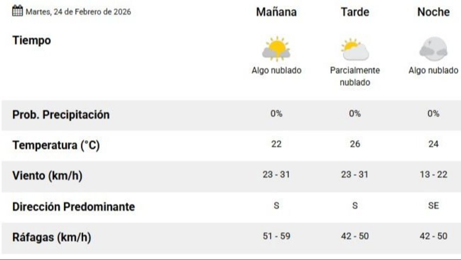 Según el Servicio Meteorológico Nacional (SMN) (en el pronóstico actualizado a las 6.07 horas), para este martes 24 de febrero en Santa Rosa el día va a estar parcialmente cubierto, algo despejado, algo nublado. Amanece más frío y se vienen unos días con temperaturas un poco más bajas, con mínimas de 10 y 11 grados. Pero para hoy la mínima se ubica en los 18ºC mientras que la máxima se va ubicar en los 26 grados. La dirección predominante del viento será del sur y del sureste por la noche y, durante todo el día, el viento va a soplar intenso, con ráfagas que podrían alcanzar los 60 km/h. Una jornada ventosa. La humedad para hoy es de 88%. Se hace de noche cada vez más temprano y el sol se va a poner cerca de las 20.02 horas.