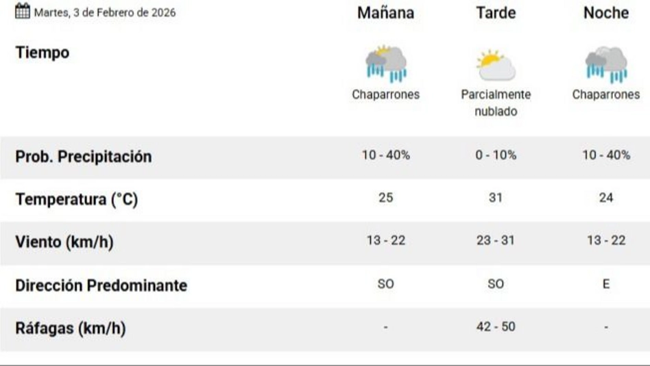 Según el SMN (en el pronóstico actualizado a las 5.39 horas), para este martes 3 de febrero en Santa Rosa la la temperatura mínima es de 18ºC, mientras que la máxima se ubicará en los 31 grados. Se generarán chaparrones (10-40% de probabilidades) por la mañana, por la tarde estará parcialmente soleado, en tanto por la noche volverán los chaparrones aislados (10-40%). Durante la tarde también podrían generarse ráfagas de viento de hasta 50 km/h, viento del sudoeste. La humedad para la jornada del día de hoy es del 93%.