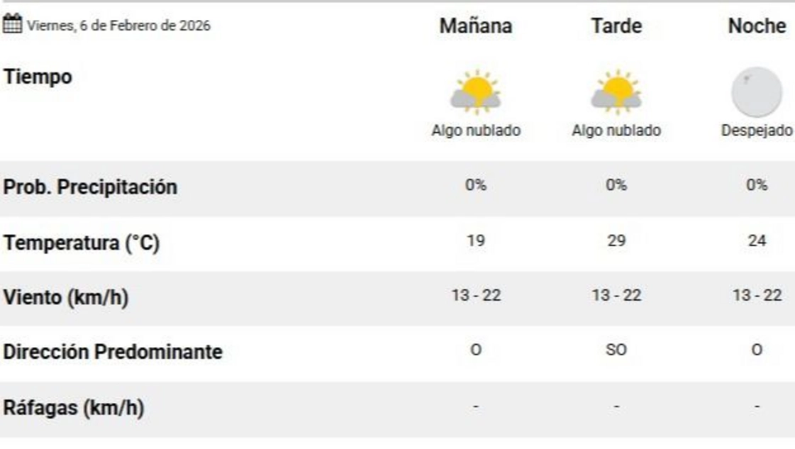 Según el Servicio Meteorológico Nacional (SMN) (en el pronóstico actualizado a las 5.51 horas), para este viernes 6 de febrero en Santa Rosa la la temperatura mínima es de 11ºC y la máxima se va a ubicar en los 29 grados. Para la mañana como para la tarde se espera que el cielo esté algo soleado y algo nublado. Va a oscilar entre un cielo limpio y brillante y uno de nubes pasajeras, que también esperan mucho del cielo pampeano. Se sentirá una brisa leve de viento del oeste. Muy leve. De 8 kilómetros. La humedad para la jornada del día de hoy es del 83%.