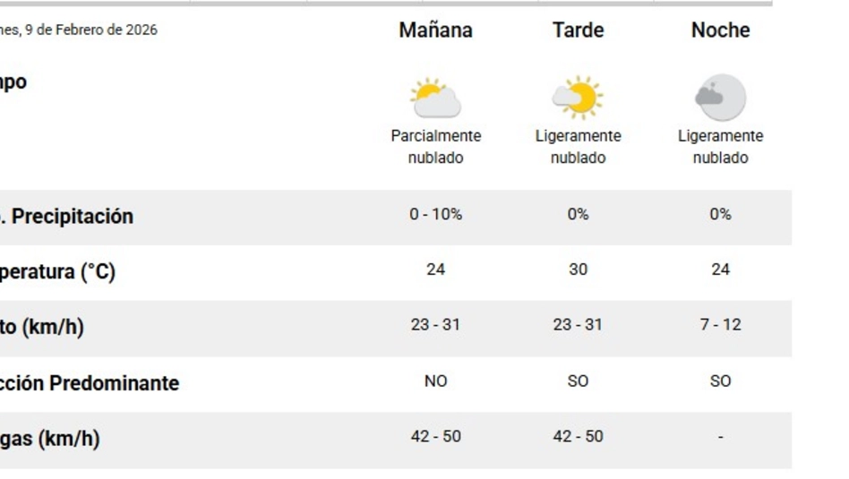 Según el Servicio Meteorológico Nacional (SMN) (en el pronóstico actualizado a las 6.23 horas), para este lunes 9 de febrero en Santa Rosa la la temperatura mínima es de 18ºC y la máxima se va a ubicar en los 30 grados. Para toda la jornada, mañana, tarde y noche, el cielo va a oscilar entre parcial y ligeramente cubierto, entre limpio y brillante y de nubes pasajeras. Por la mañana y por la tarde, se esperan ráfagas de viento de hasta 50 km/h. Habrá viento del noroeste y, después, del suroeste. La humedad para la jornada del día de hoy es del 88%.