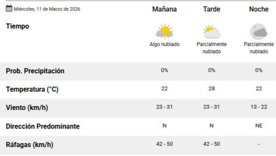 El Servicio Meteorológico Nacional (SMN) (en el pronóstico actualizado a las 5.40 horas), indicó que para este miércoles 11 de marzo en Santa Rosa el día con una mínima de 15 grados y el día se va a ir volviendo cálido, luminoso, con una máxima de 28ºC. Amanece despejado, abierto, pleno. El cielo con algunas nubes blancas y el celeste enorme de fondo. Va a estar algo nublado y van a llegar más nubes y de a poco van a ir cubriendo los rayos que no quieren dejar de asomar. La dirección predominante del viento va ser norte y noreste. Durante la mañana y la tarde podrían desarrollarse ráfagas de 50 km/h. La humedad para el día de hoy es de 94% y la noche va a llegar a las 19.42 horas.