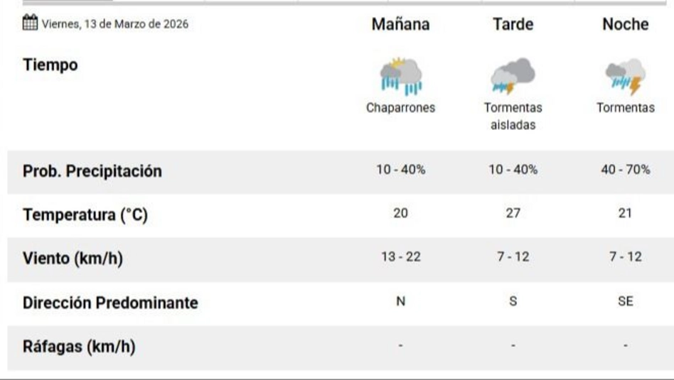 El Servicio Meteorológico Nacional (SMN) (en el pronóstico actualizado a las 5.54 horas), indicó que para este viernes 13 de marzo en Santa Rosa el día empieza húmedo, mojado, repleto de charcos. La mínima es de 16 grados y la máxima va a ser de 27ºC. Las nubes grises llegaron para instalarse. Espesas. Traen el agua y en agua se van a quedar. Va llover mucho. Parece que sí, que llegan los chaparrones durante la mañana, algunas tormentas aisladas (10-40%) por la tarde y precipitaciones más intensas por la noche (40-70%). La dirección predominante del viento va ser norte y sur y sureste. La humedad para el día de hoy es de 87% y el sol se va a poner a las 19.39 horas y la noche cada vez llega más temprano.