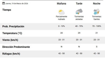 Para el viernes 20, el pronóstico del SMN indicó que va a llover. Vuelve el alerta y las tormentas fuertes y aisladas para todo el día. Las probabilidades de lluvia son de entre 40- 70%. El día entero. Todo va a ser agua. El día va a empezar con una mínima de 17 grados y la máxima se va a mantener baja,. hasta los 23ºC. La dirección predominante del viento va a ser sur y este y sureste. Y durante la tarde y la noche se podrían generar ráfagas de hasta 50 km/h.
