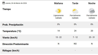 Con respecto al sábado 28, se siente leve el aumento de la mínima. Se va a ubicar en los 16 grados, en tanto que la máxima se va a ubicar en los 26ºC. La mañana se va a mantener parcialmente cubierta y podrían llegar a gestarse algunas tormentas aisladas con un 10-40% de probabilidades. La dirección predominante del viento va a ser norte y se espera que las ráfagas de viento puedan llegar a ser de hasta 50 km/h.