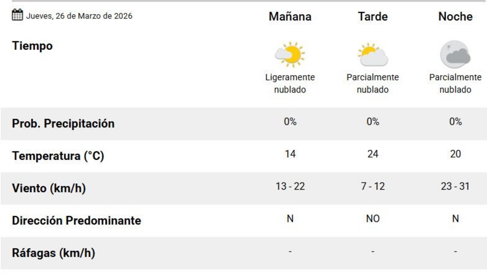 Amanece y la mínima es de 10 grados mientras que la máxima para el día de hoy va a ser de 24°C, apenas unos grados más que ayer. La mañana empieza a los tirones entre un cielo que quiere despejar y un azul que se cubre entre parcial y ligeramente. El sol en esas nubes que aparecen como ventanas y de a ratitos se filtra brillante y enorme. La dirección predominante del viento para este jueves va a ser norte, noroeste y norte. La humedad para el día de hoy es de 89% y el sol no va a demorar en irse y va a terminar por esconderse cerca de las 19.20 horas.