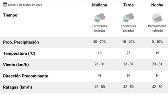 Con respecto al miércoles 11 de marzo, va a haber un leve aumento de la temperatura. Sale, de a poco el sol. No del todo, no va a ser un cielo totalmente despejado. Va a estar algo cubierto. La dirección predominante del viento va a ser norte con ráfagas que podrían alcanzar a los 50 km/h.. La mínima va a ser de 16 grados y la máxima se va a ubicar en los 29ºC. Un pequeño veranito antes de que se asiente el otoño.