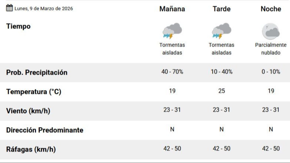 En cuanto al martes 10, si bien el cielo va a permanecer parcialmente cubierto, también va a ser parcial la salida del sol. Va a oscilar entre lo luminoso y lo gris. Todo el día va a estar así. Tratando de escampar. El SMN indicó que la temperatura mínima va a ser de 17 grados, mientras que la máxima se va a ubicar en los 26°C. La dirección predominante del viento va ser norte y noreste.