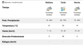 En cuanto al viernes 3, feriado por ser viernes Santo, vuelve la posibilidad de agua, pero leve, entre un 10 y 40% de probabilidades. Para la tarde y la nocha va a estar mayormente nublado. La temperatura mínima va a ser de 18 y la máxima de 26 grados. La dirección predominante del viento va a ser suroeste y sureste y las ráfagas podrían llegar a alcanzar los 50 km/h.