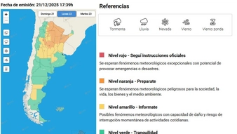 "El área será afectada por tormentas de variada intensidad, algunas localmente fuertes. Las mismas estarán acompañadas por frecuente actividad eléctrica, granizo ocasional, ráfagas que pueden superar los 70 km/h y abundante caída de agua en cortos períodos. Se prevén valores de precipitación acumulada entre 30 y 70 mm, que pueden ser superados en forma puntual", precisó el comunicado del organismo nacional del clima.