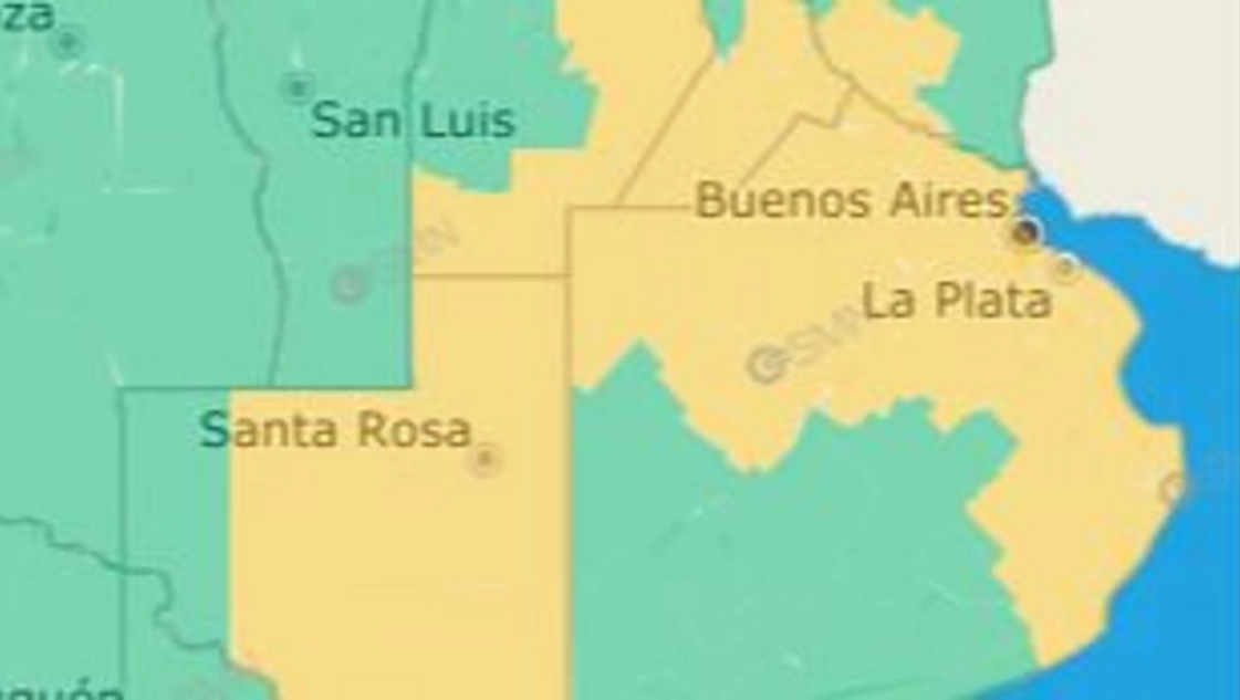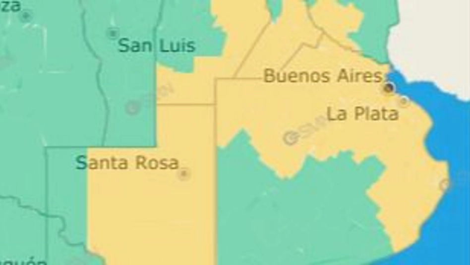 Por otra parte, el SMN indicó que durante la tarde y noche del viernes, y madrugada del sábado, el alerta cubrirá el sur y este de Córdoba, sur de Santa Fe, sur de Entre Ríos. El alerta también ocurrirá por la tarde y noche en gran parte del territorio de Buenos Aires.