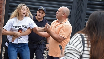 Familiares, amigos y amigas de Lía se concentraron frente a la vivienda de Roldán donde al grito de "asesino" y a los pedidos para que solo pida "perdón" recibieron el auto policial que entró a un patio interno de la casa.