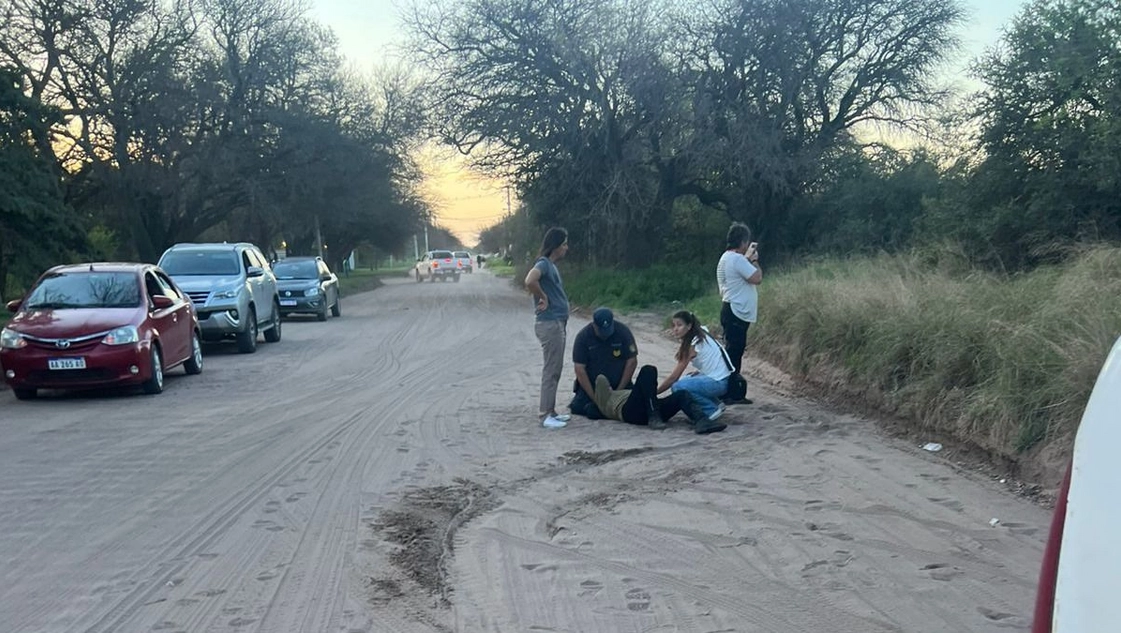 Por allí transitaba una pareja de 64 años a bordo de una motocicleta marca Gilera modelo Voge DS525X. El conductor explicó que, a dos cuadras de su casa y luego de haber hecho un viaje de aproximadamente dos mil kilómetros, "debido a el exceso de arena en la calle y por el peso de la moto la cual se encontraba con equipaje lleno, pierde el control del rodado comenzando a zigzaguear". Unos veinte metros después cayó "al piso y su pareja apoya el pie en tierra firme, cayendo la moto encima de su pierna izquierda".