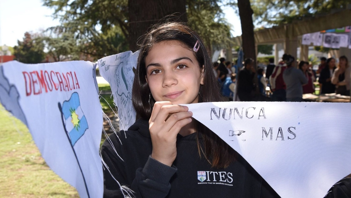 “Más allá de la opinión de cada uno creo que es muy importante saber, conocer, informarse. Fue algo muy terrible y creo que nos impacta mucho saber que chicos de nuestra edad podían ser secuestrados y asesinados solo por pensar distinto. Hoy podríamos ser nosotros esos chicos”, advirtió Agustín detrás de la mesa que exhibía fotos e información sobre hechos destacados en esa etapa negra del país.