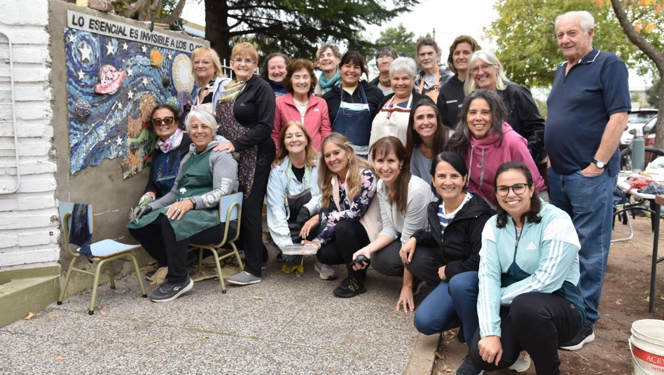La titular de Arco Iris Pampa, Mónica Quinteros, señaló que “esta idea se gestó en octubre de 2025, en oportunidad de la instalación del mural ‘Darle color a la vida’ en el Hogar de Ancianos de Santa Rosa. En ese momento se solicitó al equipo de murales de Arco Iris Pampa, la realización de un mural en mosaico en el frente del edificio, en el marco de este aniversario de su creación”.