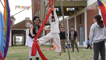 Las profesoras de los talleres de circo ofrecieron un espacio para que los más chicos puedan realizar acrobacias en tela. También participó la Radio Municipal, que transmitió todo el evento en vivo.