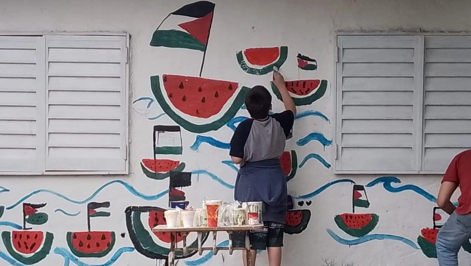 Tras estas actividades, pasaron a la pared del aula-taller que estuvieron acondicionando durante semanas y allí plasmaron el mural. "La idea era hacer algo con la sandía, que fue un símbolo de resistencia cuando estaba prohibida la bandera de Palestina, y los barcos de la flotilla que lleva ayuda humanitaria y que fue salvajemente reprimida", añadió.