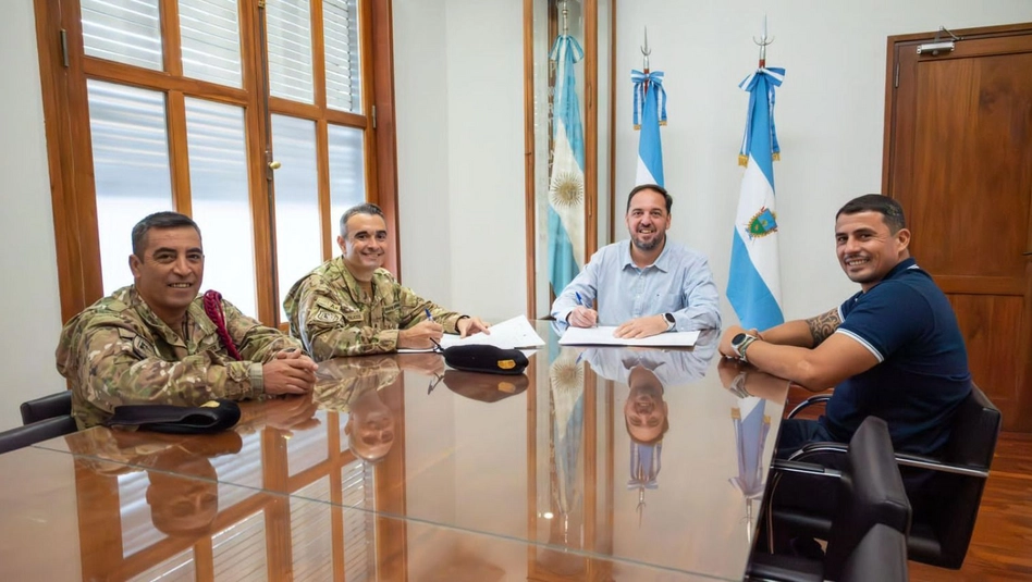 El intendente Luciano di Nápoli firmó el convenio de cooperación con el Mayor Santiago José Palacios, jefe de la Compañía de Ingenieros Mecanizada 10 del Ejército Argentino. "El acuerdo permite combinar el equipamiento municipal con la capacidad logística del Ejército para realizar las tareas de excavación y preparación de una nueva cava", explicaron.