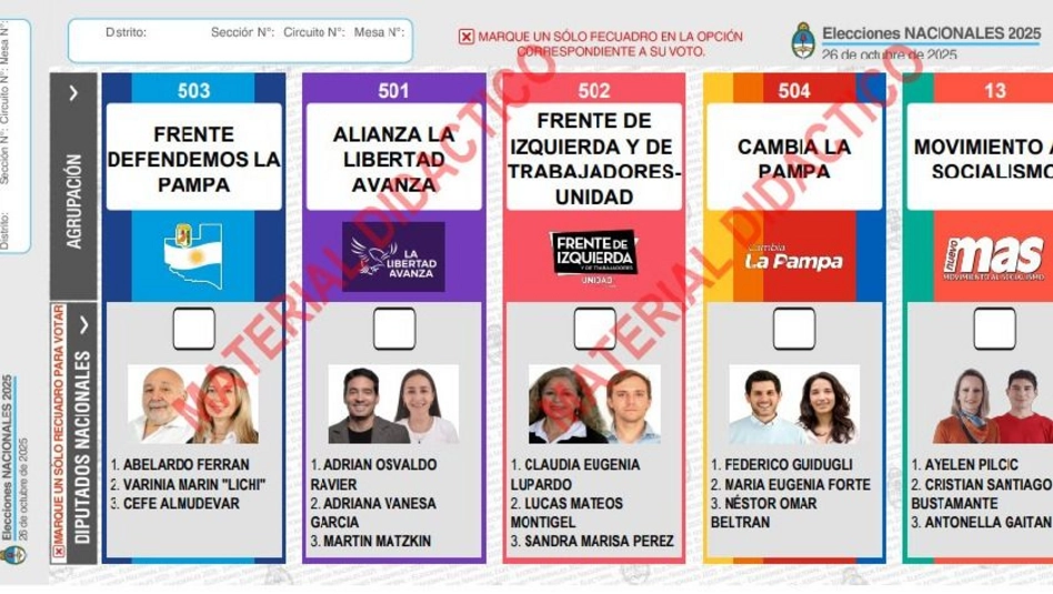 La Boleta Única de Papel tendrá en el primer lugar la lista 502 Defendemos La Pampa encabezada por los candidatos del frente peronista Abelardo Ferrán, Varinia Marín y Ceferino Almudevar. Luego, la lista 501 de La Alianza la Libertad Avanza (PRO y LLA) con los candidatos Adrián Ravier, Adriana García y Martín Matzkin; la lista 502 Frente de Izquierda y de Trabajadores Unidad (FIT-U) de Claudia Lupardo, Lucas Montigel, y Sandra Pérez. La lista siguiente es la 504 de los radicales Cambia La Pampa de Federico Guidugli, María Eugenia Forte y Néstor Beltrán, mientras que la lista 13 de Movimiento al Socialismo (MAS) estará encabezada por Ayelén Pilcic, Cristian Bustamante y Antonella Gaitán.