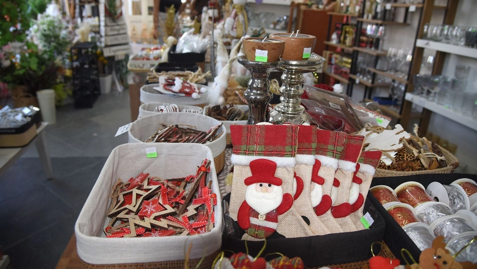 “Hay distintos adornos para la puerta. Tenemos de lana o de madera con luces, con algún cascabel. Arrancan en $ 10.000 y llegan hasta los $ 40.000. Las boas en color dorado, plateado y verde están $ 4.000. También tenemos vajilla combinada, individuales, servilleteros…”, explayó.