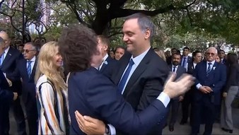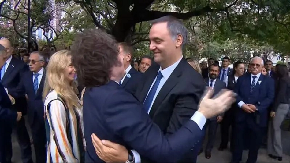 Milei, que dio un claro mensaje de apoyo a Adorni, al llevarlo al acto central por Malvinas en Retiro, le dio un fuerte abrazo donde además estaba presente la secretaria general de la Presidencia Karina Milei que miraba con sonrisa la secuencia.